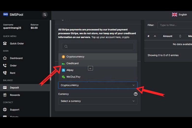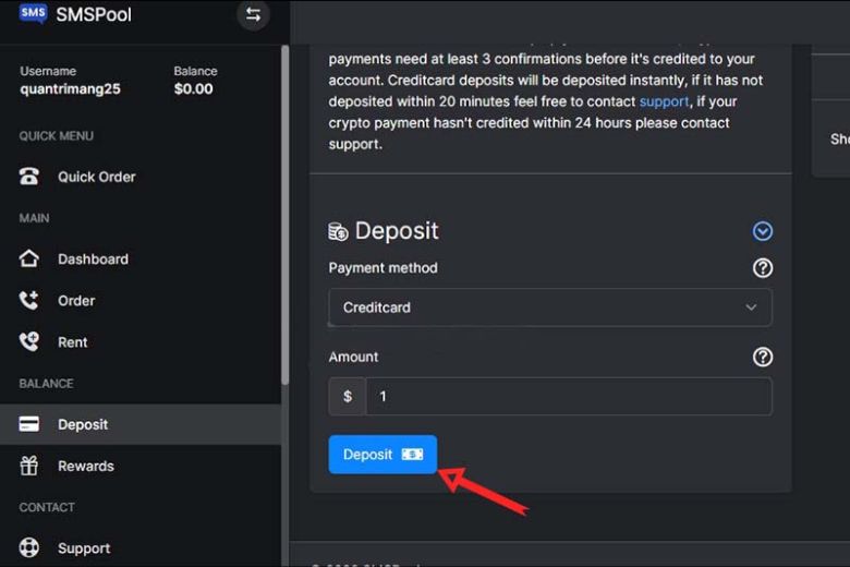 Bước 5: Sau đó bạn cần tiến hành nạp tiền để có thể thuê số điện thoại ảo > bấm chọn vào mục Deposit > kế đến chọn vào mục Credit Card > ngoài nguồn thanh toán này thì còn có thể chọn Cryptocurrency – Tiền ảo, ví Alipay hoặc Wechat Pay.